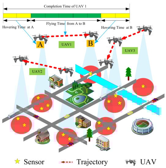 Due to their tremendous application potentials in military and civilian related applications, Wireless Sensor Networks (WSNs) have attracted increasing research interest in many fields, such as industrial process control, environmental monitoring, and battlefield surveillance [1,2,3,4]. Generally, WSNs are composed of small, battery-limited sensors which cannot transmit over a long distance [5]. There is a great interest recently in utilizing rotary-wing Unmanned Aerial Vehicles (UAVs) as mobile information collectors in WSNs [6,7,8]. They can move towards the sensors and establish reliable connections with them due to their high mobility and flexible deployment [9]. Rotary-wing UAVs are equipped with propellers that enable them to hover over fixed locations. This advantage makes them suitable candidates for mobile information collectors as they can hover over sensors to collect information [10,11]. Nowadays, with the popularity of WSNs, a single UAV cannot meet the demands of monitoring missions over larger monitoring areas. Information collection of WSNs with multi-UAV cooperation is more desired. Currently, there are two types of methods to collect the information from WSNs with multiple UAVs. The first is to use static UAVs to form a network to cover all sensors, which is suitable for small area monitoring [12,13,14,15]. The second is to use mobile UAVs to cover a larger area [16,17,18]. As shown in Figure 1, we mainly focus on the second scenario in this paper.