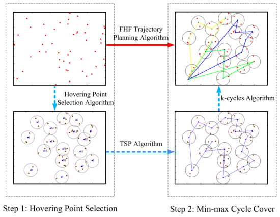 As shown in Figure 2, we propose FHF algorithm which includes two steps. First, we propose a hovering point selection algorithm to select appropriate hovering points with considering the information collection quality. Red dots represent sensors and blue dots represent optimized hovering points. The number of hovering points is less than that of ground sensors. Not stopping above each sensor node, we select appropriate hovering points where the UAVs can sequentially collect the information from multiple sensors. By hovering at different points, which are close to different subsets of sensors, the UAVs can obtain better wireless communication links and decrease the flying time compared with the policy of hovering above each sensor. Moreover, the policy of hovering above each sensor was used as a comparison algorithm in our simulations.