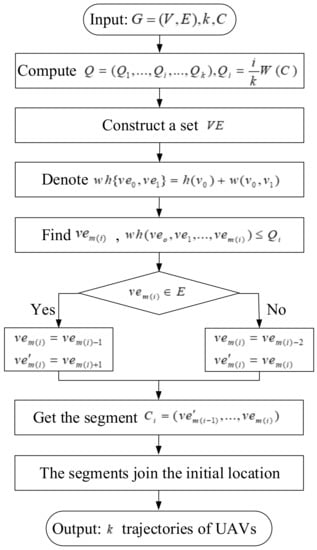 The heuristic algorithm we propose includes two steps to plan the trajectory of each UAV. Firstly, the ant colony algorithm is used for obtaining a cycle C covering all hovering points. As a global searching algorithm, the ant colony algorithm can solve TSP problems [47]. Then, we use a novel k-cycles algorithm for getting the trajectory of each UAV [48]. This algorithm mainly decomposes cycle C into k segments.