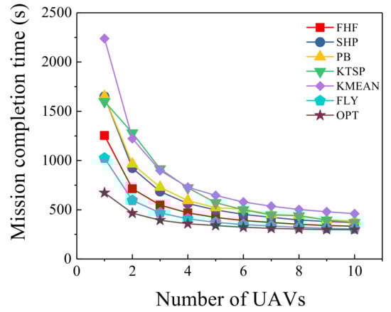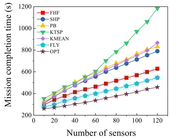 In this simulation, with different number of sensors, the number of UAVs was fixed at three and the seven algorithms were compared. As the number of sensors changes, the trend of mission completion time is shown in Figure 5. It was observed that the algorithms we proposed significantly outperformed four other algorithms. FHF and FLY algorithms were the closest to the optimal solution compared with four other algorithms. FLY algorithm achieved almost the same performance with the optimal scheme when , and the mission completion time difference was less than . When the number of sensors was greater than 20, FLY algorithm was also closer to the optimal scheme than five other algorithms. For example, when , FLY algorithm was of the optimal solution, which was the biggest gap between FLY algorithm and the optimal scheme in this simulation. It was also observed that the completion time of mission conducted only in static case cOULD not be smaller than in both static and mobile cases. FLY algorithm was reduced by 7.0–14.1% compared with FHF algorithm. That was expected; since UAVs utilized the flying phase to collect information, the hovering time was reduced. Meanwhile, we found that our subalgorithm (FHF) performed better than the other compared algorithms. FHF algorithm was reduced by 3.5–46.9% compared with four other algorithms. When the number of sensors was 10, FHF algorithm was reduced by compared with KMEAN algorithm. When the number of sensors was 120, FHF algorithm was reduced by compared with KTSP algorithm. By hovering at a point where it could communicate with multiple sensors, the UAV could decrease the flying time compared with SHP algorithm, PB algorithm and KTSP algorithm. In particular, when the number of sensors increased, the UAV could communicate with more sensors at one hovering point. Therefore, our algorithms performed better when the number of sensors was large. Moreover, SHP algorithm and PB algorithm use the same TSP algorithm, thus the performance was relatively close. Meanwhile, KMEAN algorithm selected hovering points without considering the information collection quality of UAVs. There was retransmission in the actual transmission, which increased the information collection time and KMEAN algorithm did not reach the effect of selecting the hovering points. Therefore, KMEAN algorithm was close to SHP algorithm and PB algorithm.