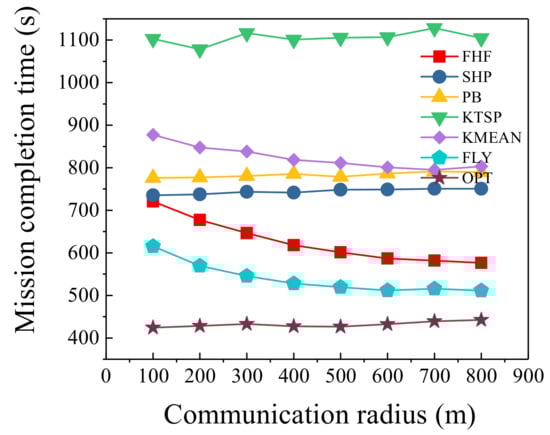 Under different communication radius, we set the number of UAVs at 3 and the number of sensors at 120, and compared the seven algorithms. Figure 7 shows the trend of mission completion time as the communication radius changes. Under different communication radius, our algorithms were closer to the optimal scheme than four other algorithms. As the communication radius increased, our algorithms had obvious advantages. When the communication radius was 100 m, FLY algorithm was of the optimal algorithm, and FHF algorithm was of the optimal algorithm. However, when the communication radius was 800 m, FLY algorithm was of the optimal algorithm, and FHF algorithm was of the optimal algorithm. As shown in Figure 7, the mission completion time of our algorithms and KMEAN algorithm gradually decreased as the communication radius increased, and other algorithms’ change trends were relatively small. The reason is that the change in communication radius mainly affected the hovering point selection algorithm, which is an important difference between three algorithms and three other algorithms. Since we considered the information collection quality in hovering point selection algorithm, our algorithms had a higher performance improvement compared with KMEAN algorithm. Of course, in practical applications, the communication range of the UAV is related to the altitude and the communication equipment of the UAV.