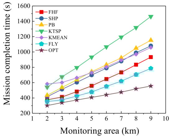 Under different monitoring area size, we set the number of UAVs at 3 and the number of sensors at 100 and compared the seven algorithms. Figure 8 shows the trend of mission completion time as the monitoring area size changes. It was observed that FHF and FLY algorithms were closer to the optimal solution than four other algorithms. The gap between FHF algorithm and the optimal solution increased as the monitoring area expanded, from to . The gap between FLY algorithm and the optimal solution increased as the monitoring area expanded, from to . As the monitoring area became larger, the advantage of FLY algorithm was more obvious. FLY algorithm was reduced by 6–15.6% compared with FHF algorithm. That was expected; since the larger area caused a long flying time, the UAVs could obtain more time to collect information when flying. Furthermore, FHF algorithm was reduced by 9.7–40.2% compared with four other algorithms. As the monitoring area size increased, the flying scope of the UAV became larger, and the flying time became longer, resulting in longer mission completion time. As shown in Figure 8, FLY algorithm performed the best under different monitoring area size. Since it fully considers the information collection quality and the positions of sensors, the algorithm can be applied to different monitoring area size. Based on the simulation results in the previous subsection, if the communication range of UAVs is appropriately changed, the mission completion time will be shorter.