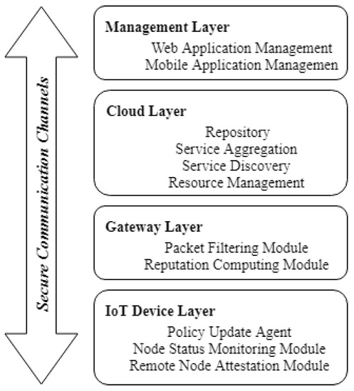 The outstanding feature of IoT devices is their ability to ensure system security using limited resources. The endpoints are the most vulnerable to attacks because they are often installed in open space environments and an attacker can gain physical access to them, leading to security breaches in which the attacker can compromise the hardware and software configurations and alter the information transmitted over the network. In this regard, the proposed architecture includes, at the device layer, a remote attestation framework that has the role of checking the hardware and software configuration.