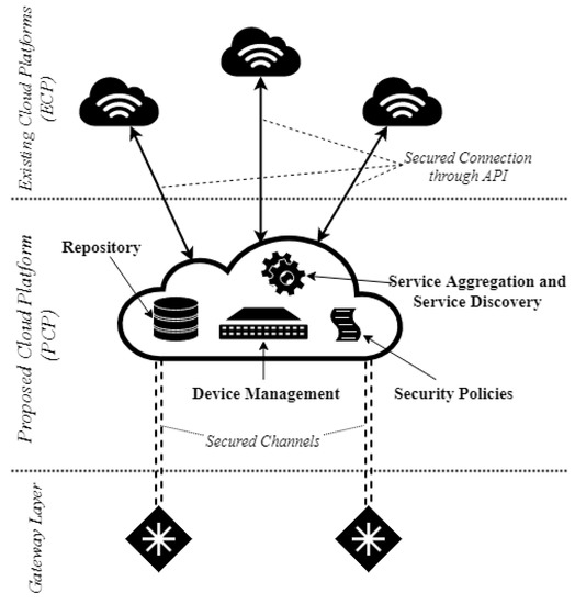 As we mentioned before, the feature that links our proposed security framework with other centralized IoT systems is the Cloud module that acts as an access point for users to connect to different services and as a management module for the underlying IoT system, but with reduced capabilities. The Proposed Cloud Platform (PCP) was not designed as a replacement for the Existing Cloud Platforms (ECP), but as a security “complement” for them, adding additional features to enforce control over devices (behavior and data). Data is exchanged between these two Cloud platforms by means of APIs exposed by the ECP. In this manner, we ensure that data coming from gateways is filtered so that the ECP does not receive corrupted information and that users obtain the correct results when accessing services. Thus, the first functionality from the reduced set that the PCP implements is to be an element of overseeing and enforcing specific security rules and policies, meant to limit the infusion of malicious data due to a rogue gateway. Aside from filtering traffic flows, the PCP acts also as a service discovery module for the gateway and devices layers, by aggregating services available on different ECPs. As a mention, the services that are aggregated by the PCP are services that are allowed by the administrators of the IoT environment and the underlying devices can be linked to. By ensuring this service, data collected inside the IoT system is available to other IoT systems. Still, the PCP monitors and secures these connections, enforcing the rules of access control defined at the moment of establishing connections with these “exterior” services. Being a policy enforcement point, the PCP permits the traffic flow, from end-point IoT devices, only to secure upper layer services (legitimate ECP entities).