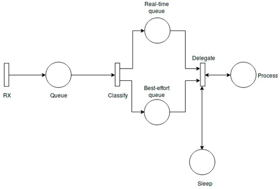 - Classify—it classifies the messages based on their priority. Given the healthcare context, there can be two types of messages: contextual messages which are handled following a best-effort paradigm and critical messages which are handled on a real-time basis. This transition does not follow a stochastic model and it is triggered for every change occurred in the Queue states.