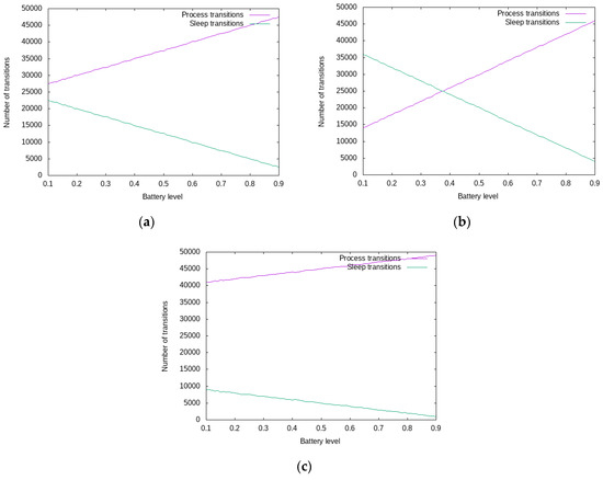 Thus, a developer can model the power consumption of the IoT gateway in a custom manner and obtain the application specific trade-off between security and availability. In Figure 4 it can be observed that the number of transitions into the Sleep and Process states have a linear dependence on the battery level: the number of transitions into the Process state is increasing along with a high battery level, while the number of transitions into the Sleep state is increasing along with a low battery level.