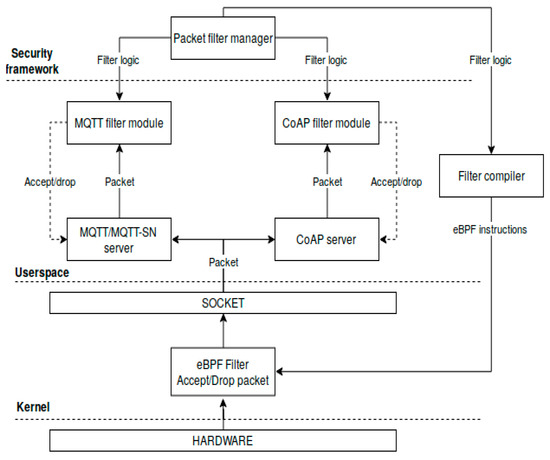 The packet filtering architecture also uses an IoT node virtual instance on the gateway side, which keeps the device state (e.g., filtering commands, online state, etc.) and acts as a buffer between the gateway and the physical IoT device. Each packet filter routine uses a suite of packet qualifiers (e.g., source IP address, MQTT identifier, MQTT QoS value) which triggers the routine. A kernel space filtering mechanism requires the usage of an operating system (e.g., lightweight Linux), which can be a drawback for bare-metal systems or for systems that are not eBPF compatible. To overcome this drawback, the proposed IoT security framework implements a hybrid kernel/userspace filtering mechanism. The userspace filtering mechanism is implemented as an application protocol security module. The security module has a well-defined interface and it is called by the core packet application protocol daemon for each received packet. By using a packet filtering interface, the module can be easily replaced with a custom one without changing the core protocol implementation. The userspace filtering module consists of a collection of routines that can execute tasks like packet inspection or accept/drop the packet based on the authentication/authorization state. Like the kernel filtering mechanism, the userspace module uses packet qualifiers that can lead to a packet reject action if they are correlated with the sender/receiver authentication state. At the gateway side, the userspace filtering module can receive filtering policies (ACL structure) from the endpoint nodes by using the secure control communication channel. In a particular MQTT scenario, an endpoint IoT node can install the following policies: