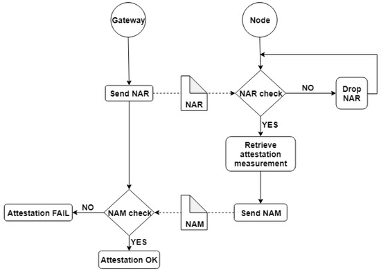 The proposed attestation framework has a generic structure that implements a secure message protocol and relies on an external module for obtaining the integrity measurements (e.g., TPM, Linux IMA). Whenever the gateway wants to check the integrity of a node, it sends a Node Attestation Request (NAR) message to the IoT device. The NAR message consists of a nonce and an Hash-based Message Authentication Code (HMAC) signature, computed over the nonce value, using a pre-shared key established between the endpoint device and the gateway during the device enrollment phase. After receiving the NAR message, the node validates it by verifying the HMAC signature, thus mitigating DoS attacks where a malicious entity sends multiple attestation requests to the device in order to exhaust the computing/energy resources of the node. If the NAR message is validated, the endpoint device executes the attestation measurements by means of an external module (e.g., methods mentioned at the beginning of this subsection). After obtaining the integrity measurement values, the endpoint device sends to the gateway a Node Attestation Measurement (NAM) message which consists of integrity measurement values along with an HMAC signature, computed over the integrity measurement values concatenated with the nonce received from the gateway. The HMAC signature of the NAM message is computed using the same pre-shared private key, established between the IoT device and the gateway. The gateway validates the HMAC signature of the NAM packet (using the request nonce and the pre-shared key) and checks if the integrity measurement values are the same with the values stored on the gateway side. If the signature is invalid or the integrity measurement values are incorrect, the gateway marks the device as compromised and ceases any communication with it. The attestation state machine on the IoT device and gateway side take into consideration a connectionless transport protocol, sending the messages multiple times before transitioning into an error state. The remote attestation message protocol is presented in Figure 6.