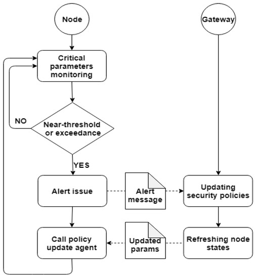 When the gateway receives an alert from the node about its status, it will update the security policies and forward the information to the node, which in turn will call the policy update agent installed at its level. The policy update agent can also be called by the node when it detects that the preset thresholds are exceeded. In this case, the node initiates the process of updating security policies by sending a request to the gateway (see Figure 7).