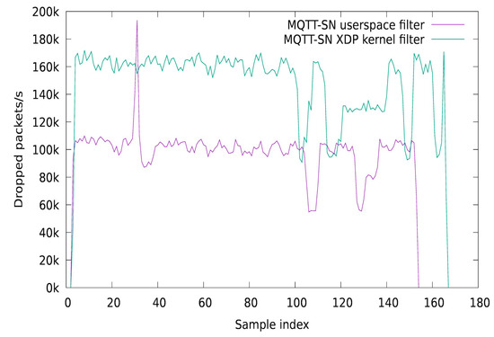 In Figure 9 are presented the results of a second test case, where we analyze the rate of processed packets per second in a case of DoS attack. The DoS attack scenario consists of a malicious device that sends 100 million MQTT-SN packets with a QoS value of 1 and a legitimate device that sends the same number of packets with a QoS value of 0. As it can be observed, when the gateway uses the XDP kernel filtering method, it can process 20 k more legitimate packets, than when using the userspace alternative.