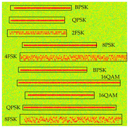 Cognitive radio (CR) [1,2,3] has been used to refer to radio devices that are capable of learning and adapting to their environment. Due to the increasing requirements for wireless bandwidth of radio spectrum, automatic signal detection and modulation recognition techniques are indispensable. It can help users to identify the modulation format and estimate signal parameters within operating bands, which will benefit communication reconfiguration and electromagnetic environment analysis. Besides, it is widely used in both military and civilian applications, which have attracted much attention in the past decades [4,5,6,7].