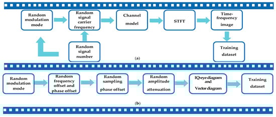The generation processing of the dataset. (a) dataset for signal detection; (b) dataset for modulation recognition.