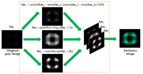 For modulation recognition, traditional eye diagram and vector diagram are binary images, which do not consider the signal aggregation degree at a particular location. Hence, we consider the signal aggregation degree and enhance the traditional eye diagram and vector diagram. Figure 4 presents the enhancement processing of the dataset. In our initial research, since CNNs are insensitive to edge information, the signal amplitude is quantified between [−1.05, 105] by 128 after normalizing the amplitude. Furthermore, the parameter settings are obtained by experiments. For example, we choose 800 symbols and 4 symbols as a waveform group to generate the eye diagram and the vector diagram, and related experiments will also be described in detail in subsequent chapters. Moreover, we perform the following operations on the images to make the image details more prominent, where is the original image, are the channels of the enhanced image and are scaling factors.
