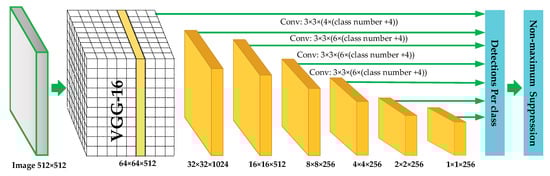 We use SSD networks to achieve multi-signals detection. For DL target detection techniques, the existing algorithms are mainly divided into two kinds: algorithms based on region recommendation (two-stage methods) and algorithms based on regression (one-stage methods). Regression-based algorithms include YOLO series algorithms [40,41,42,43] and SSD series algorithms [43,44], while region recommendation-based algorithms include RCNN [45], Fast RCNN [46], and Faster RCNN [47]. In our research, since the regression-based algorithms are faster than region recommendation-based algorithms, we use SSD networks as our signal detection model. SSD networks can generate a series of fixed-size borders and the possibility of the containing target in each border. Finally, the final detection and recognition results are calculated by the non-maximum suppression algorithm [48]. The structure of SSD networks is shown in Figure 5, and it can be divided into four parts.