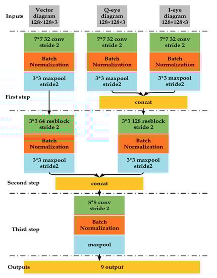 The signal features extraction can be divided into three stages. On the first stage, we use 7 × 7 convolution kernels to convolute IQ eye diagram and vector diagram, respectively. To ensure the dynamic range unification of the feature maps, we apply the batch normalization (BN) [49] on first layer network outputs. We perform the max pooling operation on the BN feature maps. Then we connect the feature maps from IQ eye diagram inputs.