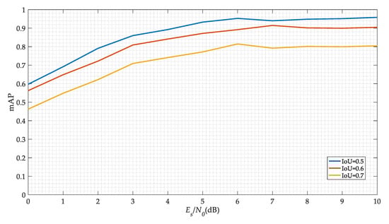 Figure 11 shows our model detection precision versus different SNRs. We choose the mean Average Precision (mAP) as the performance index of the model. To calculate the mAP, we need to calculate precision and recall. For calculating precision and recall, we need to identify True Positive (TP), False Positive (FP), True Negative (TN), and False Negative (FN). Recall is defined as the proportion of all positive examples ranked above a given rank. Precision is the proportion of all examples above that rank which are from positive. The Average Precision (AP) summarizes the shape of the precision/recall curve. Hence, the mAP is the mean of all the AP values across all classes as measured above. They can be calculated as follows