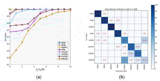For signal modulation recognition, we set a series of experiments to test the network performances. Figure 13a shows the recognition performances of each modulated signal under the different SNR. It can be seen that the algorithm can still achieve better performance when the SNR is very low. Because its modulation complexity, the performance of 64QAM signal is worse than other signals, but it still can achieve 94% accuracy at 7 dB. For BPSK and OQPSK signals, they have distinct visual characteristics from other modulated signals in the eye diagram and the vector diagram, which recognition accuracy can reach 100% even in 0 dB. And it is also obvious that the recognition performance of circular modulation signals {8PSK, 16APSK, 32APSK} is better than QAM modulation signal. To understand the results better, the confusion matrices in different SNR levels are presented in Figure 13b–d. It can be seen that the network shows excellent performance in discriminating BPSK, QPSK, OQPSK, 8PSK, and 16APSK. Moreover, in our experiments, it can be seen that 16QAM is more likely confused with 64QAM, while 16APSK is more likely confused with 64QAM.