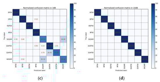The performance of each modulation (a) classification accuracy for each modulation versus SNR; (b) normalized confusion matrix in 0 dB; (c) normalized confusion matrix in 3 dB; (d) normalized confusion matrix in 10 dB
