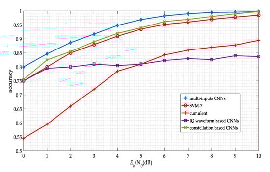 For automatic modulation recognition, algorithms based on signal phase, frequency, and amplitude have been widely used [18]. However, these algorithms are significantly affected by noise, and the performance can be substantially degraded in low SNR condition. High-order statistical-based algorithms [19,20,21,22], such as signal high-order cumulants and cyclic spectrum, have excellent anti-noise performance. The computational complexity of these methods is relatively low, but the selection of features relies too much on expert experience. It is difficult to obtain features that can adapt to non-ideal conditions. In particular, it is challenging to set the decision threshold when there are plenty of modulation formats to be classified.