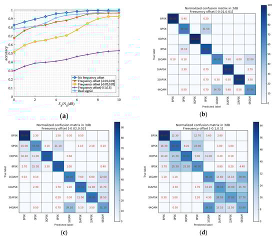 The network performance on different frequency offsets range. (a) classification accuracy for different frequency offset versus SNR; (b) normalized confusion matrix in 3 dB when the frequency offset is [−0.01, 0.01]; (c) normalized confusion matrix in 3dB when the frequency offset is [−0.02, 0.02]; (d) normalized confusion matrix in 10 dB when the frequency offset is [−0.1, 0.1].