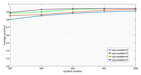 We also consider the influence of the symbol numbers and the eye number in eye diagram on the network performance. We obtain the best parameter settings of samples by grid search. The symbol number is set as 200, 400, 800, and 1000, respectively, while the eye number is set as 2, 3, 4, and 5. The results are shown in Figure 16. It can be seen that theses parameters do affect network performance. With the increase of symbol number and eye number, the overall accuracy of the model is gradually increasing. But we also can see that when the symbol number is 1000 and the eye number is 5, the improvement of performance is not obvious. Therefore, we finally choose 800 symbols and 4 eye numbers to generate the eye diagram and the vector diagram.