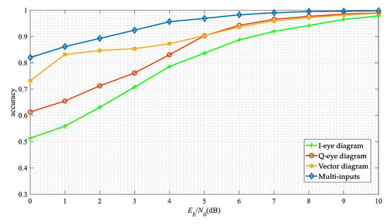 Finally, we compare the performance of the single input network with the multi-inputs network in this work. The results are shown in Figure 17. The modulation recognition algorithm based on a single eye diagram has poor performance. The performance of the I-eye diagram is lower than that of the Q-eye diagram, which may be due to the setting of the initial phase in the same modulation format. And the performance of the vector diagram based method is also inferior to our method, since it does not make full use of the signal waveform information.