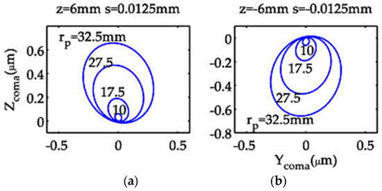 Coma curves of the model optical system in the meridional focal plane, illustrating changes in pattern with rp, for settings (a) z = 6 mm and s = 0.0125 mm and (b) z = −6 mm and s = −0.0125 mm.
