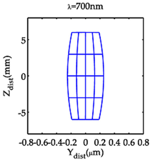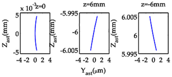 Figure 7a shows the deviations of individual spots obtained by the spot-diagram formulas from the corresponding ideal image points (0,0,0), (0,0,0.6) and (0,0,6). Figure 7b shows the deviations of individual spots generated by ray tracing using ZEMAX from the corresponding ideal image points. The deviations between ideal image points and spots from a simulation model (such as the theoretical simulation model or the ZEMAX simulation model) depend on both the system aberrations and model errors. The root-mean-squares RMSΔY and RMSΔZ of the deviations are given in the respective diagrams. Here, distinctions between the individual corresponding spots in Figure 7a,b—both in size and position—are mainly determined by different model errors. However, the difference between RMSΔY and RMSΔZ of the spots in Figure 7a,b is smaller than 0.4 μm in the Y direction and 0.7 μm in the Z direction. Therefore, the present theoretical model is similarly as useful as the ZEMAX model in designing and optimizing the Offner optical system. Certainly, supplemented by the fourth- and higher-order aberration terms into the spot diagram formulas (25) and (26), more exact theoretical model may be developed.
