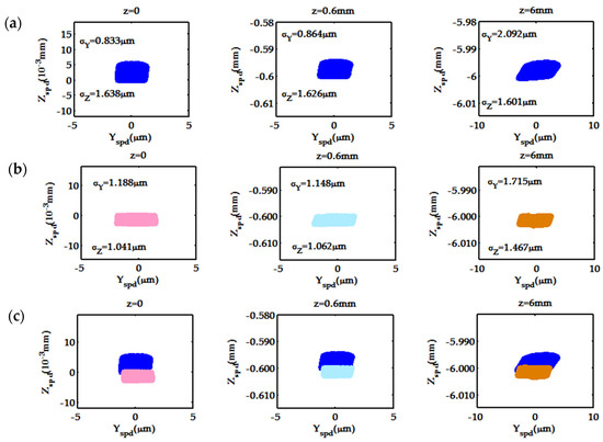 The standard deviations σY and σZ of the spots in the Y and Z directions (Figure 6a,b) illustrate the similarity in spot shape. The difference between the standard deviations of corresponding individual spots is smaller than 0.4 μm in the Y direction and 0.65 μm in the Z direction. Nearly the same dispersion tendency is seen depending on the system aberrations for the spot diagrams generated by both the present theoretical model and the simulation model of ZEMAX.