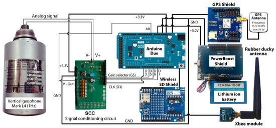 - Soler-Llorens, J.L.; Galiana-Merino, J.J.; Giner-Caturla, J.; Jauregui-Eslava, P.; Rosa-Cintas, S.; Rosa-Herranz, J. Development and programming of Geophonino: A low cost Arduino-based seismic recorder for vertical geophones. Comput. Geosci. 2016, 94, 1–10. [Google Scholar] [CrossRef]