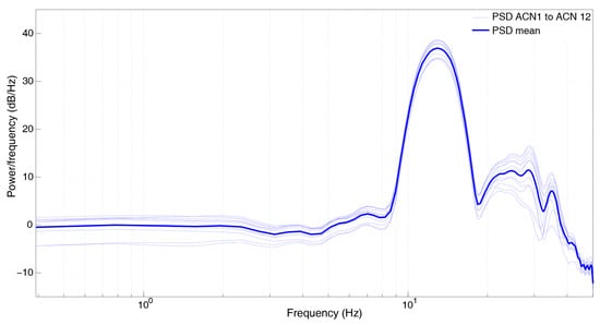 The next laboratory experiment focused on the analysis of the strict synchronization of the ACN modules. In order to analyze the correct system synchronization, a common input signal was connected simultaneously to the 12 ACN modules, and then the corresponding recorded signals were compared. Several 0.1V input signals were used for this test, from 1 to 15 Hz, using the Tektronix AFG310 function generator. The ACN modules were configured with gains of 20 dB (×10), 0 dB (x1) and 0 dB (x1) for the INA155, LTB5 and Arduino Due amplifiers, respectively; and the selected sampling frequency was 500 Hz. The recording duration was set to 10 s. In Figure 18, we show the first second recorded by the 12 ACN modules for the frequencies of 1, 5, 10 and 15 Hz. The obtained results clearly show a good synchronization among all the stations for the frequency range of interest.