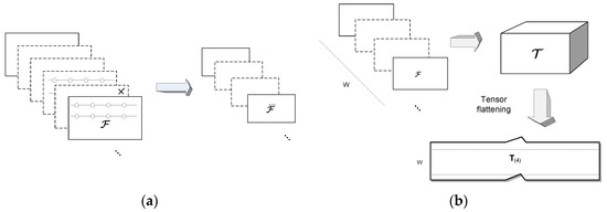 where denotes either reduced version of the original tensor . This process is depicted in Figure 2a. It should be noted however, that in experiments on video signals the second method, that is scale-space decimation, provided better results by 1–4%, compared to the tensor randomization. This can be caused by natural characteristics of the visual signals in which neighboring pixels are highly correlated. Therefore, in further considerations we refer to the second method of tensor reduction. However, the randomized version can be a beneficiary in the cases with not so strong correlation of neighboring elements [5,38]. Moreover, in our experiments the same decimation coefficient D, in order 0.2–1.0, was used to uniformly reduce tensor size in all dimensions.