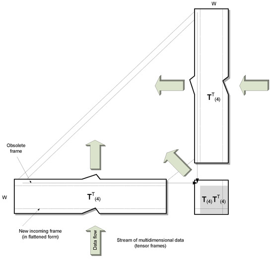On the other hand, if fits to the model, the model needs only to be updated. Figure 4 depicts the proposed efficient method of updating of the flattened version T(4) of the model tensor. This is done by simple insertion of only the new row and obliterating the oldest row in the T(4) matrix. Consequently, in the product matrix all values except one row and one column can be reused, as shown in Figure 5. The following steps describe the model update algorithm (Algorithm 2).