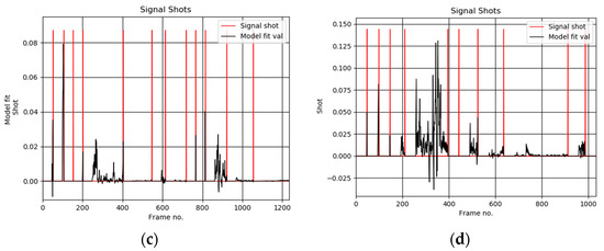 Plots of the detected scene shots computed by our method in the video sequence no 28 (a), 38 (b), 48 (c), and 58 (d) from the Open Video Database [4], respectively. Frames were decimated in space and time by a factor 0.33.
