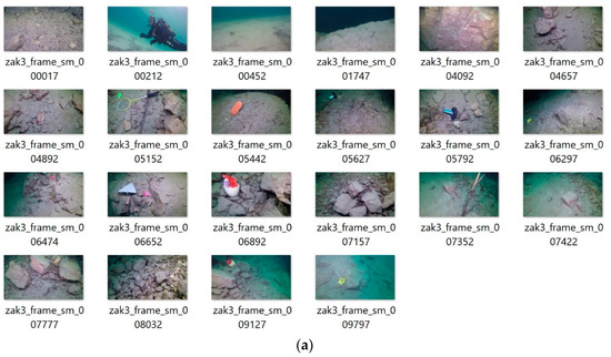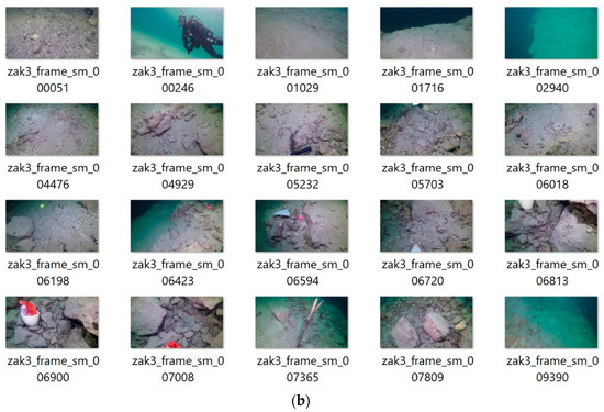 The proposed method was finally applied to another problem of object search in underwater video signals. In this experiment a number of human-made objects, such as a shoe, a trowel, a wheel, etc. where drawn in random places in the artificial lake (Zakrzówek, Poland). Then the footage was acquired which contains these, as well as thousands of natural objects, such as stones, plants, underwater hills, etc. There is a total of 10,845 frames in the video. From these, subjectively representative images with various objects were chosen. After that, the method was run with the same parameters as in the previous experiments. The user selected representative frames, as well as results of our method, are presented in Figure 8a,b, respectively.
