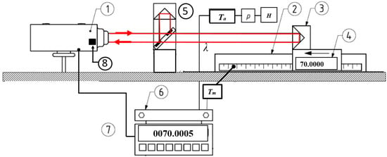Example of a laser interferometer operation: 1: laser head, 2: slide way, 3: measurement corner-cube, 4: machine-axis reading, 5: beam splitter and reference corner-cube, 6: compensation unit, 7: displacement read-out and 8: photo-detector.