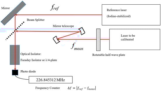 The laser vacuum wavelength is commonly calibrated by a so-called beat-measurement: the laser beam is mixed with a laser beam of an iodine-stabilized He-Ne-laser that acts as a primary length standard. This is a major, and in many cases the only, application of an iodine-stabilized He-Ne laser that is present as the primary realization of the meter in many national laboratories. The typical set-up is sketched in Figure 2 [,]. The laser beam to be calibrated is mixed with the laser beam of the reference laser. When the beams are well aligned, interference between these beams occurs with a frequency that is equal to the frequency difference between the beams. The half-wave plate is used to align the polarization direction of the laser to be calibrated to polarization direction of the reference beam, so that interference is effective. The telescope mirrors are intended to reduce the beam diameter to be equal to that of the reference laser, so that the interference intensity is optimal. The optical isolator is intended to prevent optical feed-back to the laser; especially iodine-stabilized lasers can be very sensitive to this.