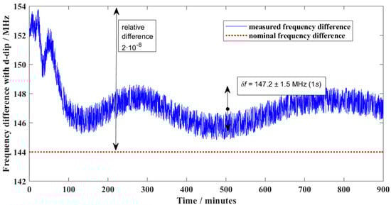 The iodine-stabilized reference laser as depicted in Figure 2 can be considered as quite some overkill considering its limited contribution to the uncertainty (typically 50 kHz or less) when compared to the laser stability (up to some 10 MHz, see Figure 3) and other uncertainty sources (see next sections). Therefore, it can be argued that another laser, calibrated and stable at the 10−8 level, could be used as well, inserting another step in the calibration chain. When a heterodyne laser is used [,], the frequency difference between the beams—if well recorded and documented—can be used to establish the sign of the frequency difference.