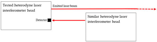 A displacement laser interferometer is based on the interference of a light beam that is emitted by a laser. Commonly, this laser is frequency stabilized. This stabilization can be based or two-mode or Zeeman-stabilization []. They can operate as homodyne or heterodyne interferometer, where, respectively, one and two frequencies are used. The operation principle and a comparison between these two principles were summarized by Cosijns [] (see sections 10.2.1.1 and 10.2.1.2 in this reference). An example of a laser interferometer operation that illustrates its use and the features that might require calibration is given in Figure 1. The laser interferometer system uses the sensors as indicated in Figure 1 to calculate the displacement. Both homodyne (operation at a single laser frequency) and heterodyne (using two laser beams with a slightly different frequency) systems use in the end the following equation to calculate the measured displacement (see equation 10.15 in []):