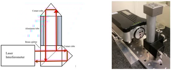 It is known that laser interferometer systems exhibit linearity errors due to the interpolation between fringes, the δ in Equation (1). These have been intensively studied and modeled in literature [,,]. In these studies on periodic linearity, usually a third-order polynomial or several harmonics of a Fourier transform are used to describe the deviations. In general, it can be concluded that under normal circumstances (well aligned system, optics as supplied with the system) these deviations are of nm-level. Normally the set-ups made for calibrating large displacements as described in Section 3 are not accurate enough to detect such deviations. The calibration of nm-level displacements is a subject on its own, where the techniques may vary from X-Ray interferometers [] and Fabry-Perot interferometers [,] to separated beams in a heterodyne interferometer []. In the case of laser interferometers the knowledge that the non-linearity must be periodic with a period of λ/2 can be used to simplify the calibration. For example, the displacement can be calibrated against a PZT (Lead (Pb) Zirconate Titanate) device in a small range, where the typical periodic deviations from the laser interferometer can be separated from the PZT-non-linearity that will have a more monotonic behavior [], or it can be calibrated against a reference laser for which the periodic deviations are already calibrated. When an uncertainty of a few nm is sufficient and more specialized equipment is not available an effective simplified calibration can be carried out by using a slightly warmed-up aluminum tube and assuming that the length changes in a monotonous way while the tube cools down to the environmental temperature [,]. Because of the high linear expansion coefficient and the high thermal conductivity of aluminum the tube exhibits a significant length change, while the air inside the tube shows little turbulence. The length change as a function of time can be fitted by a polynomial, and the deviations from linearity can be identified as non-linearities caused by the laser interferometer system combined with its optics. As the method introduces some noise as well, it determines an upper limit, which may be sufficient for laser interferometer systems considered here. Figure 6 gives a picture and a schematic of this set-up.