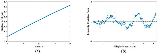 A displacement is generated by warming up the tube by hand and letting it cool down to room temperature. During the cooling-down period the displacement is recorded with a sampling frequency of 20 Hz as a function of time; see Figure 7a. A second-order fit is made to the time as a function of the displacement. The deviations from this fit were recalculated to displacements and these were plotted as linearity deviations as a function of the displacement, see Figure 7b. The figure shows that for this example the linearity deviations are within ±2.5 nm. This dataset can be found in Supplementary Materials. The literature reports even smaller values for linear displacement systems based on corner cubes [].