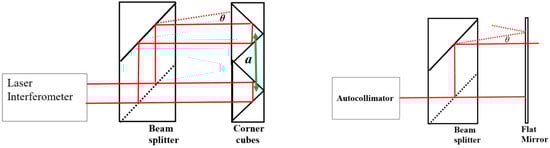 Figure 9 (left) gives the typical configuration of the angular optics; the figure at the right gives the configuration for the calibration of an important characteristic, especially when the beam splitter/mirror configuration is assembled separately. This deviation will appear as an angular difference between the beams transmitted and reflected in the beam splitter. Instead of the autocollimator, a flatness interferometer, typically of the Fizeau type, may be used as well.