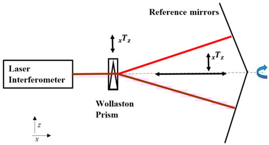 The deviation from straightness can be calibrated using a linear displacement device that displaces the Wollaston prism in the z- direction while it is at a stationary position. When calibrating a machine tool, this can be accomplished on-machine by calibrating the vertical displacement at a fixed x-position against the machine tool z-axis reading. For the straightness reference, the flatness of the reference mirrors can be measured, e.g., using a Fizeau interferometer. An alternative is a classical reversal method: the straightness of a slide way is measured and this measurement is repeated with the reference reversed, i.e., rotated 180° around the x-axis as indicated in Figure 10. The mean value of the straightness deviations is the absolute straightness of the guidance and the difference between the measurements is divided by two is the effective straightness deviation of the optics. This method is mentioned by Evans in an overview of reversal methods [] and was recently applied in a detailed analysis of these optics [].