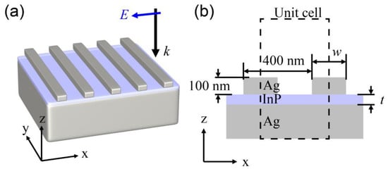We theoretically proposed a subwavelength thickness RGB color detector by using a metamaterial consisting of metal (Ag) strips on an ultrathin high-absorbing semiconductor material (InP) planar layer with a silver substrate, as shown in Figure 1. The silver strips with a width of w and a height of 100 nm were placed with a one-dimensional periodicity of 400 nm. The thickness of the InP layer is represented as t. The detected color can be easily controlled by adjusting the width of the silver strips and thickness of the InP layer. The color detectors have a limited operation spectral range, which determines the detection color. Here, the detection color was defined by converting the absorbance spectrum into the corresponding color. In addition, we further optimized the color detector to cover a broader color space by changing the metal to gold (Au) or the semiconductor layer to gallium phosphide (GaP) or by using a wide periodicity. The optical properties of the metals Ag and Au and dielectric material, InP, are applied to the simulations by referring to the papers written by Johnson [23] and by Aspnes [24], respectively. InP is also considered as dispersive media for the wavelength range from 400 nm to 700 nm.