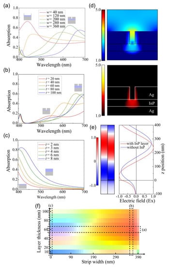 In our simulation, we investigated the absorption spectrum as functions of the width (w) of the Ag strip and thickness (t) of the InP layer. Figure 2a–c illustrate the absorption spectrums as a function of each parameter, such as w with t fixed at 60 nm (Figure 2a); t with w fixed at 350 nm (Figure 2b); and t without Ag strips on the InP layer (Figure 2c). The absorption spectrum changed when w or t changed, because the plasmonic resonance that corresponds to the peak of the absorption spectrum was excited at the edge of the strips, and the absorption spectrum’s wavelength depends on w and t [10,15]. The wider w in Figure 2a moved the absorption spectrum’s peak to the longer wavelength region, because the resonant wavelength of the metal–insulator–metal (MIM) mode generated in the gap between the Ag strips shifted to the red region when the gap decreased due to the larger effective refractive index [27]. The thicker t in Figure 2b also moved the peak to the longer wavelength region, because a larger field overlap of the plasmonic mode in the InP layer induces a larger effective index. Figure 2d depicts the electric field intensity and absorption mode profile in a structure with Ag strips for the plasmonic mode with the peak wavelength of the absorption spectrum. Light is strongly absorbed in the corners of the Ag strips and the InP layer just under the air gap, where the electric field intensity is strongly confined.