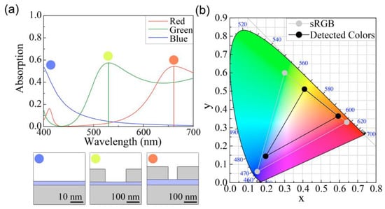 Figure 5a illustrates the absorption spectrum for the red, green, and blue colors for the second optimized structures depicted in Figure 4a,c,e. The colors detected by the second optimized structure were more vivid when compared to those detected by the first optimized structure in Figure 3, which can be clearly observed in the converted colored circles of Figure 3 and Figure 5. Figure 5b depicts the color coordinates of (a) in the CIE color space. The first optimized structure covers only 44% of the sRGB region by changing only t and w. The second optimized structure detects a larger number of colors with a larger gamut in the triangle, as depicted in Figure 5b, in which the area is even larger than the sRGB (gray line) region, i.e., 108% of the sRGB region.