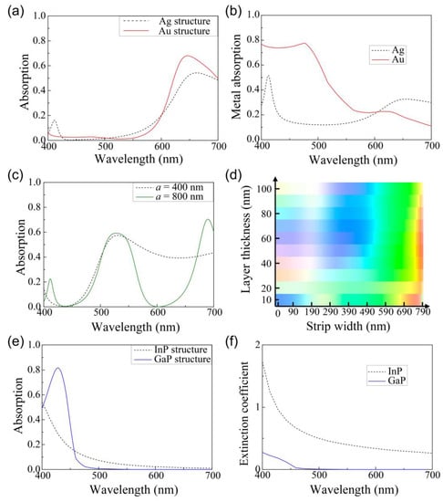 Similarly, the blue color structure was re-optimized by changing the absorber from InP to GaP, which suppressed the absorption in the long wavelength region. The absorption spectrum (black dotted line) of the InP layer in the structure detecting the blue color in Figure 3 shows the non-negligible absorption in the long wavelength region in Figure 4e. On the other hand, when the InP layer was replaced with a GaP layer, the absorption (blue line) in the long wavelength region was strongly suppressed, owing to the larger absorption at 428 nm. This is because the extinction coefficient of GaP has a meaningful value only below a wavelength of 460 nm, whereas that of the InP has a considerably large value over the whole visible wavelength range.