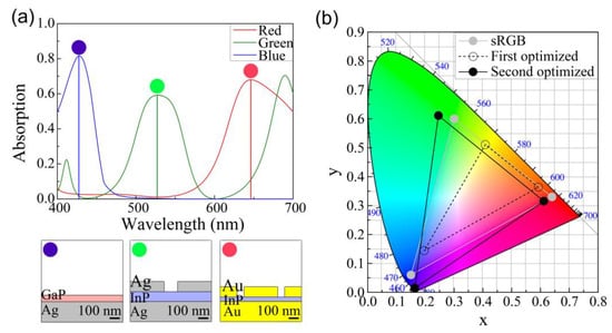 (a) Absorption spectrums and (b) color coordinates in the CIE space for the second optimized structures. The red, green, and blue colors are detected by each structure depicted in Figure 4a,c,e, respectively. The colored circles indicate the detected colors corresponding to the absorption spectrum. First (open circle, dashed line) and second (solid circle, solid line) optimized structures of (b) represent the structures in Figure 3 and Figure 4, respectively.