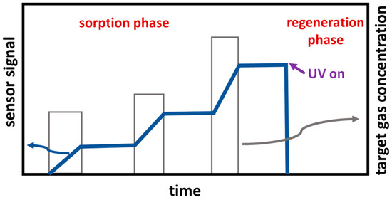 Scheme of the sensor signal of a dosimeter-type sensor with sorption phase and UV-initiated regeneration phase.