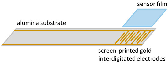 Scheme of the sensor: alumina substrate with screen-printed gold interdigitated electrodes and sensor film.